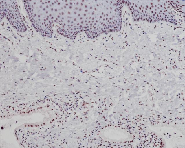 Diffuse gliomas are classified based on histological and molecular features to achieve an integrated diagnosis. Molecular diagnostic markers include IDH mutation, 1p/19q co-deletion, and TP53 mutation. ATRX is a chromatin remodeling protein and its mutation status may be used as a molecular diagnostic marker within the diffuse glioma classification algorithm. Anti-ATRX is used to identify mutant ATRX by a loss of ATRX expression in neoplastic cells when compared with internal positive controls (endothelial cells, glia, and neurons). Grade II/III astrocytoma classification includes IDH mutant, ATRX mutant, and 1p/19q retention, while grade II/III oligodendroglioma includes IDH mutant, ATRX wildtype, and 1p/19q co-deletion; p53 expression may also serve as an aid in diagnosis. ATRX mutation is frequently, but not always, mutually exclusive with 1p/19q co-deletion.1-6