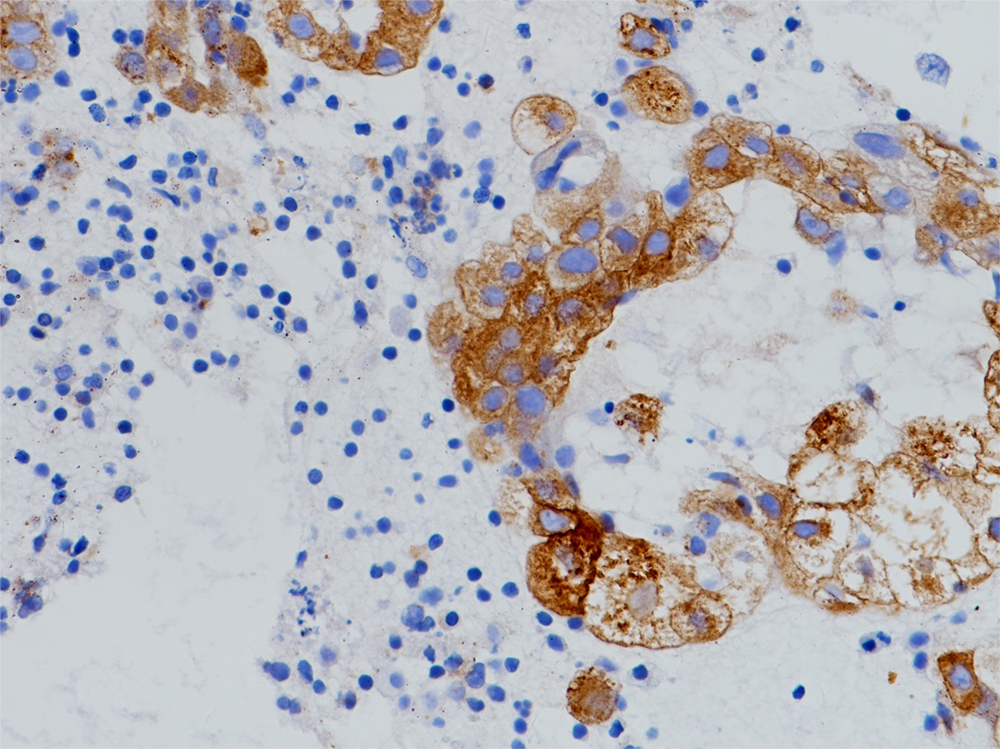 Gene rearrangements involving the ROS1 gene were first detect in glioblastoma tumors and cell lines. ROS1 fusion partners include CD74, SLC34A2 and SDC4, leading to oncogenic transformation. ROS1 rearrangement was identified in a cell line derived from a luadenocarcinoma patient and multiple studies have demonstrated its incidence in lung cancers. While ROS1 is undetectable in the normal lung, studies have described ROS1 rearrangements in 1-2% of NSCLC by FISH. Recent reports have demonstrated strong correlation between ROS1 IHC with FISH positivity. ROS1 fusions have been detected in multiple other tumors, including glioblastoma, non-small cell lung cancer, cholangiocarcinoma, ovarian cancer, gastric adenocarcinoma, colorectal cancer, inflammatory myofibroblastic tumor, angiosarc and epithelioid hemangioendothelioma.1-8