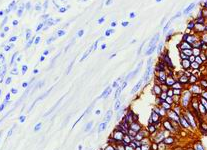 ESA抗体试剂是一种用于免疫组织化学检测的单克隆抗体试剂,主要用于识别上皮特异性抗原(Epithelial Specific Antigen, ESA/EpCAM)。该试剂通过特异性结合ESA抗原(一种40kD的跨膜糖蛋白),可有效标记正常上皮细胞和上皮源性肿瘤细胞(如腺癌、鳞癌等),在病理诊断中常用于鉴别上皮源性肿瘤与其他组织类型肿瘤。ESA抗体在乳腺癌、肺癌、结直肠癌等上皮源性肿瘤中呈阳性表达,而在肝细胞癌、肾上腺皮质癌等特定肿瘤中呈阴性,这一特性使其成为肿瘤鉴别诊断的重要工具。试剂通常采用鼠抗人单克隆抗体,需2-8℃保存,适用于多种免疫组化检测方法。