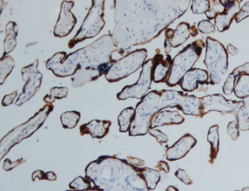 人绒毛膜促性腺激素(hCG)抗体是一种特异性识别妊娠相关肽激素的检测工具,主要用于标记滋养层来源的细胞和肿瘤。hCG由胚胎着床后产生(后期由合体滋养层细胞分泌),其核心功能是通过维持黄体孕酮分泌来保障妊娠,同时参与调节妊娠免疫耐受过程。该抗体在病理诊断中具有重要价值:①能特异性检测绒毛膜癌等滋养层肿瘤;②在非滋养层肿瘤中,肺大细胞癌(90%阳性)和肺腺癌(60%阳性)呈现较高表达率,肺鳞癌亦有20%阳性率。值得注意的是,hCG在非滋养层肿瘤中的表达可能提示侵袭性生物学行为,因其参与调控肿瘤宿主免疫反应,这使得该抗体不仅成为妊娠检测和滋养层疾病诊断的金标准,也为评估某些恶性肿瘤的预后提供了潜在分子标志。