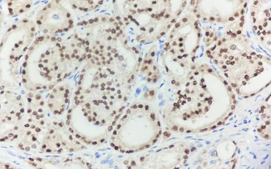 NKX3.1抗体是一种特异性识别同源框蛋白NKX3.1(前列腺特异性抑癌基因产物)的免疫检测工具。该抗体在前列腺癌诊断中表现出卓越性能:对转移性前列腺腺癌的检测敏感性达98.6%(与PSA和PSAP相当),特异性高达99.7%,其核阳性染色模式是前列腺上皮细胞的典型特征。与尿路上皮癌(通常阴性)的鉴别诊断中,NKX3.1抗体能有效区分高级别前列腺腺癌与浸润性尿路上皮癌。值得注意的是,该抗体在雌激素受体(ER)、孕激素受体(PR)和雄激素受体(AR)阳性的乳腺癌中也有表达(尤其小叶癌多于导管癌),但在前列腺癌与其他肿瘤的鉴别中仍保持高度特异性。作为受雄激素调控的前列腺上皮特异性标志物,NKX3.1蛋白表达的缺失常见于前列腺癌及上皮内瘤变,这使其成为前列腺肿瘤进展的重要生物学指标。