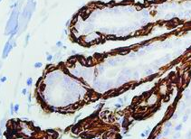 平滑肌肌球蛋白抗体是一种特异性识别平滑肌特异性肌球蛋白重链(SM-MHC)的免疫检测工具,主要用于标记平滑肌细胞及其来源的肿瘤。该抗体在病理诊断中具有重要价值:能有效区分平滑肌肉瘤(强阳性)与其他梭形细胞肿瘤(如纤维肉瘤或神经鞘瘤),同时可清晰显示血管壁、消化道等正常组织的平滑肌结构。在乳腺病理中,该抗体通过标记肌上皮细胞辅助鉴别导管原位癌(完整肌上皮层)与浸润性癌(肌上皮缺失),其特异性优于常规SMA抗体,尤其在低分化平滑肌肉瘤的诊断中具有不可替代的作用。
