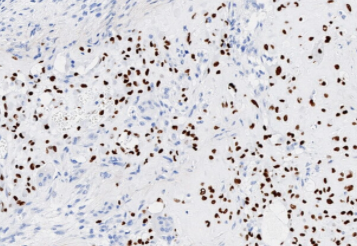 H3.3G34W抗体是一种特异性识别组蛋白H3.3第34位甘氨酸被色氨酸取代突变(H3.3 G34W)的高特异性抗体,该突变是骨巨细胞瘤(约90%病例)的特征性分子标志。作为诊断性抗体,它能有效区分H3.3 G34W突变型与其他H3变异(如H3 K36M),在骨巨细胞瘤与其他梭形细胞肿瘤(如非骨化性纤维瘤、动脉瘤样骨囊肿)的鉴别诊断中具有关键价值。该突变通过改变组蛋白甲基化模式(如导致H3K36me3水平降低)影响基因表达调控,抗体检测不仅为临床病理诊断提供分子依据,也为研究表观遗传异常在骨肿瘤发生中的作用机制提供重要工具,适用于免疫组化(IHC)、Western blot(WB)等检测方法。